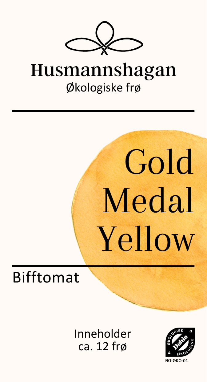 Gold Medal Yellow gir store, lysegule bifftomater med lett flate skuldre. Fruktene er kjøttfulle og saftige med en deilig og fruktig smak. Sorten trives godt også under kjølige netter og gir høy avling av flotte, solgule tomater.