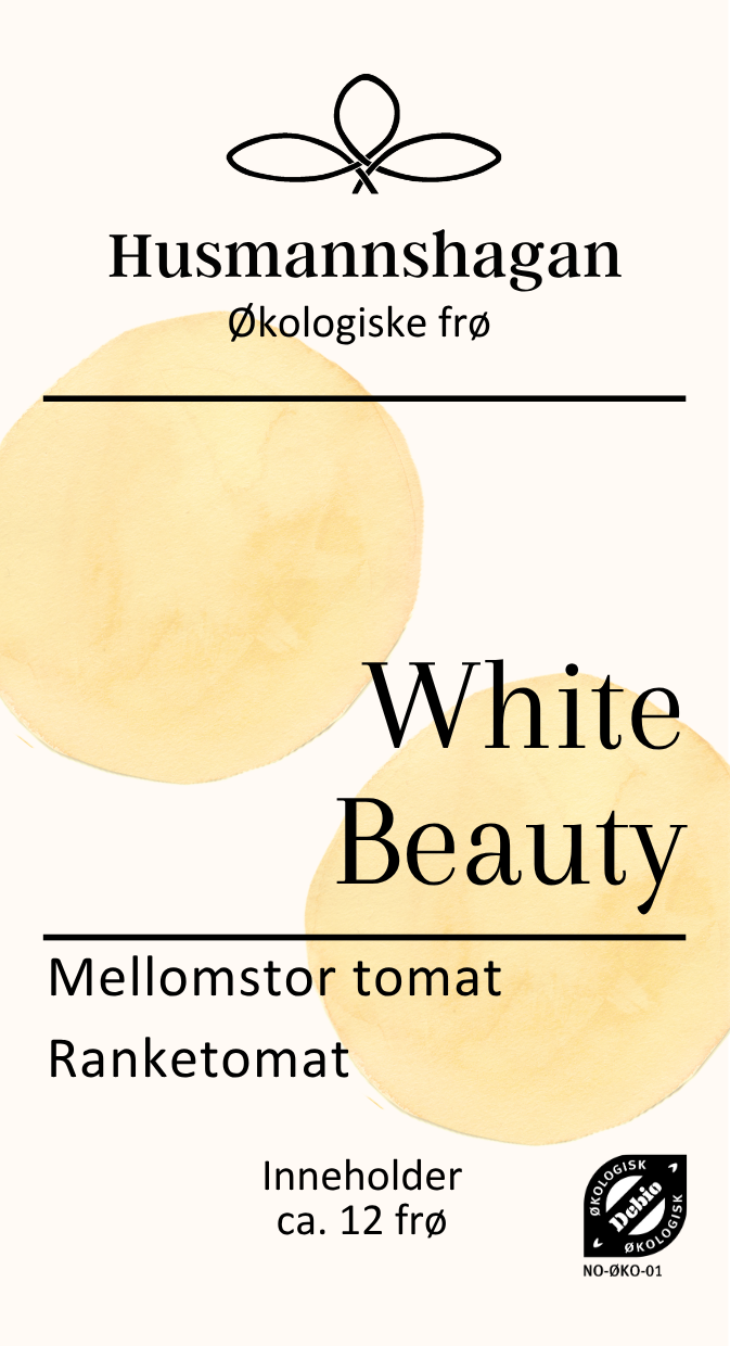 White Beauty regnes som en av de aller beste hvite tomatene – både når det gjelder smak og utseende. Fruktene er kremhvite, runde og glatte, og har en nydelig, søt og mild sitrussmak som er rikere og mer aromatisk enn hos de fleste andre hvite sorter. En vakker og delikat sort som skiller ut.