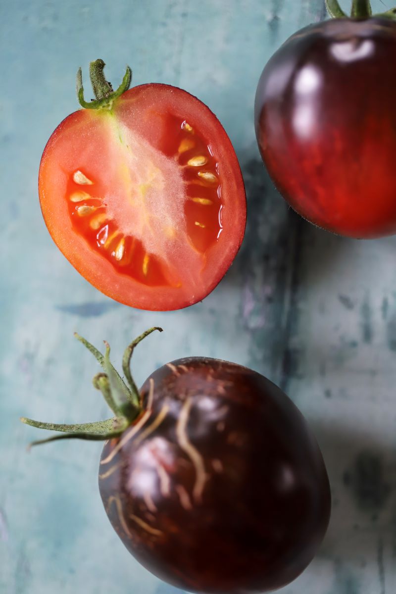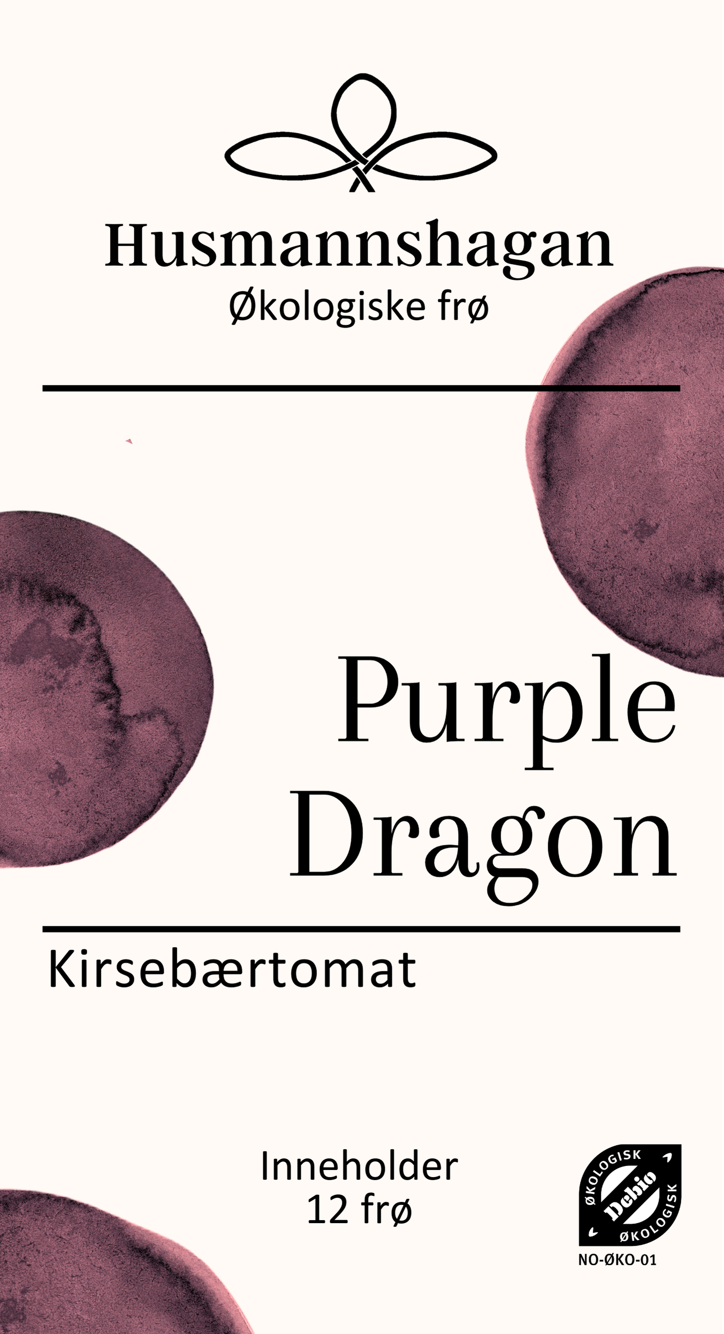 Purple Dragon har en frisk og fruktig smak. Tomatene er mellomstore og purpurfargede med mørke, indigofargede skuldre og striper.