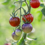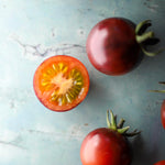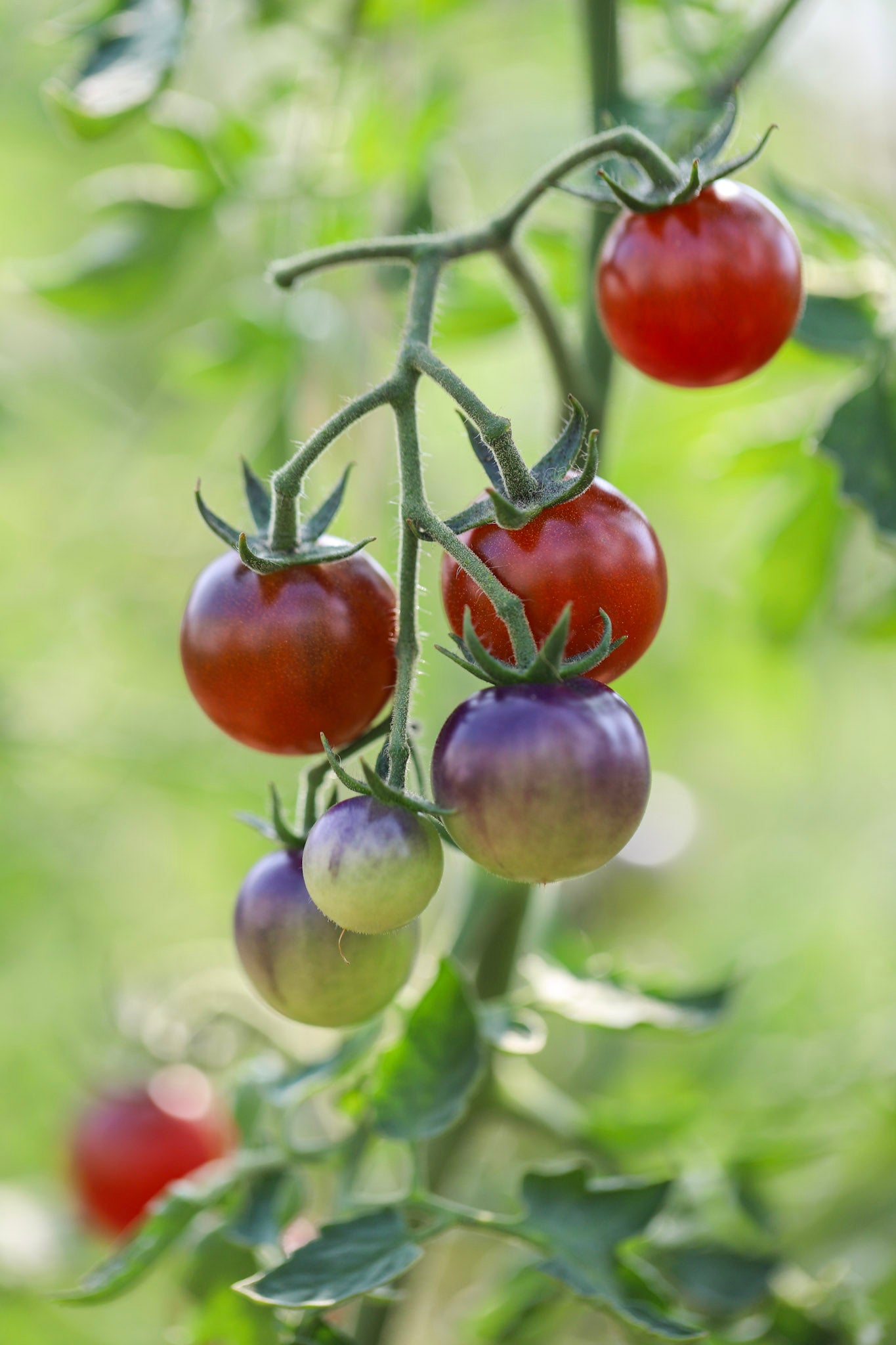 Fruktene er små og runde, ca. 30 gram, og modner fra mørk lilla til dyp lillarød etter hvert som de får sol og varme. Skinnet har et mørkt blåfiolett skjær som dannes av naturlige anthocyaninpigmenter, mens fruktkjøttet er rødt, saftig og rikt på smak. Smaken er kompleks og avrundet, søt med et lett syrlig preg som gjør den utmerket både i salater, på brødskiva og til saus.