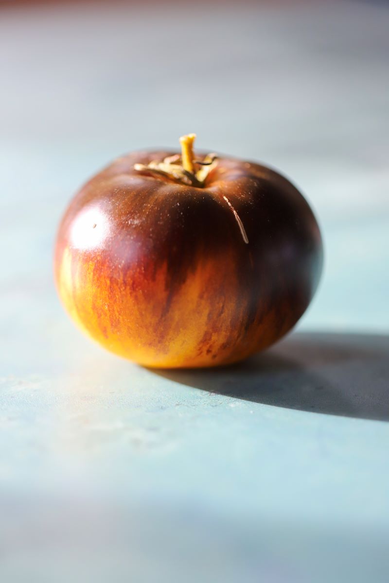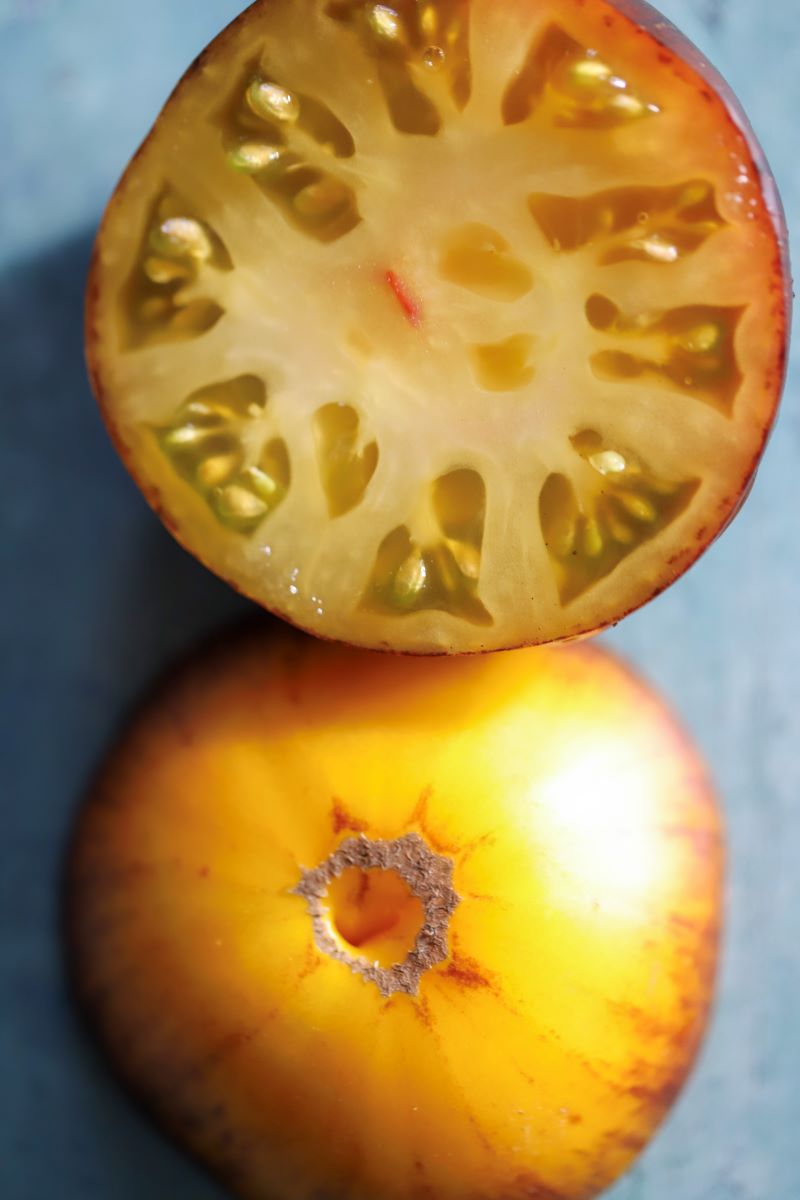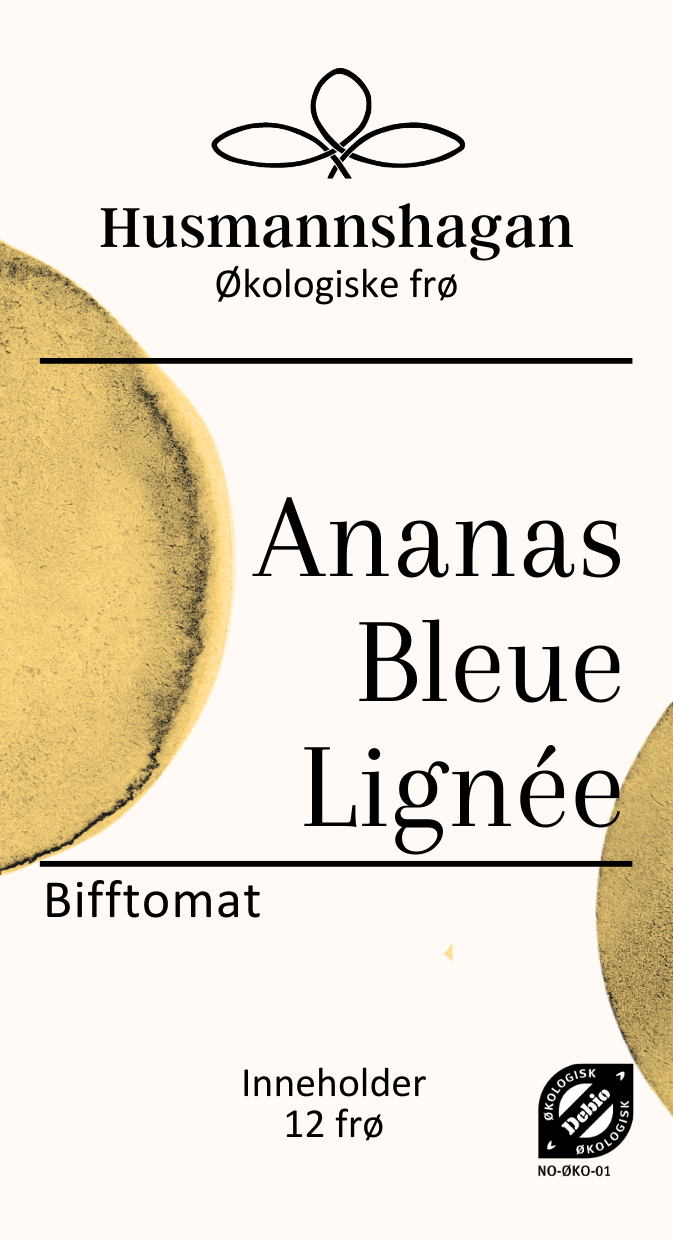 Ananas Bleue Lignée er runde, lett flate bifftomater på opptil 250 gram med innslag av rødt, oransj og gul under mørke, indigofargede skuldre. Fruktkjøttet er guloransj med innslag av rosa og rødt. Veldig saftig og god smak og få frø.