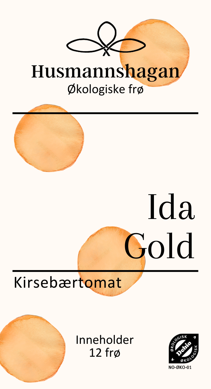 Ida Gold er en gyllen tomat med mye smak. Størrelsen varierer fra kirsebærtomat til mellomstor tomat. Veldig saftig og søt, med et hint av sitron. Gir i generøse mengder fra tidlig i sesongen og trives godt i kjølig klima. Blir ikke så høy og kan fint vokse i store krukker.